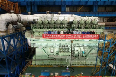 3月13日,由中國船舶集團(tuán)旗下中國動(dòng)力子公司中船動(dòng)力下屬上海中船三井造船柴油機(jī)有限公司建造的全球首制CMD-WinGD 9X92DF-2.0 iCER雙燃料主機(jī)順利交付。該主機(jī)將安裝于滬東中華為法國達(dá)飛海運(yùn)集團(tuán)建造的13000TEU集裝箱船。