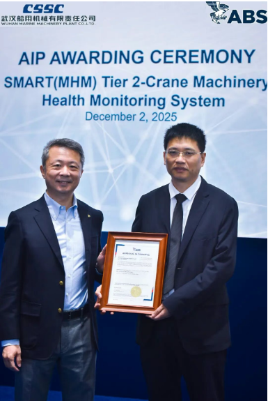 12月2日,2025年中國國際海事技術(shù)學(xué)術(shù)會議和展覽會開幕首日,中船武漢船機開發(fā)的海工吊機智能化健康監(jiān)測系統(tǒng)(SMART系統(tǒng))獲得ABS船級社SMART(MHM TIER 2)原則性批準(AIP),這是國內(nèi)海工吊機首個成功取得該AIP認證的系統(tǒng)。ABS船級社技術(shù)副總裁谷海、中船武漢船機副總經(jīng)理胡發(fā)國出席發(fā)證儀式。