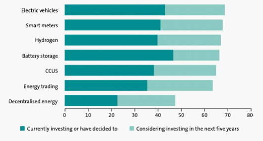 智能電表和氫儲能在當前和計劃投資模式中也表現突出,分別有41%和40%的受訪者選擇這兩種非發電能源技術。