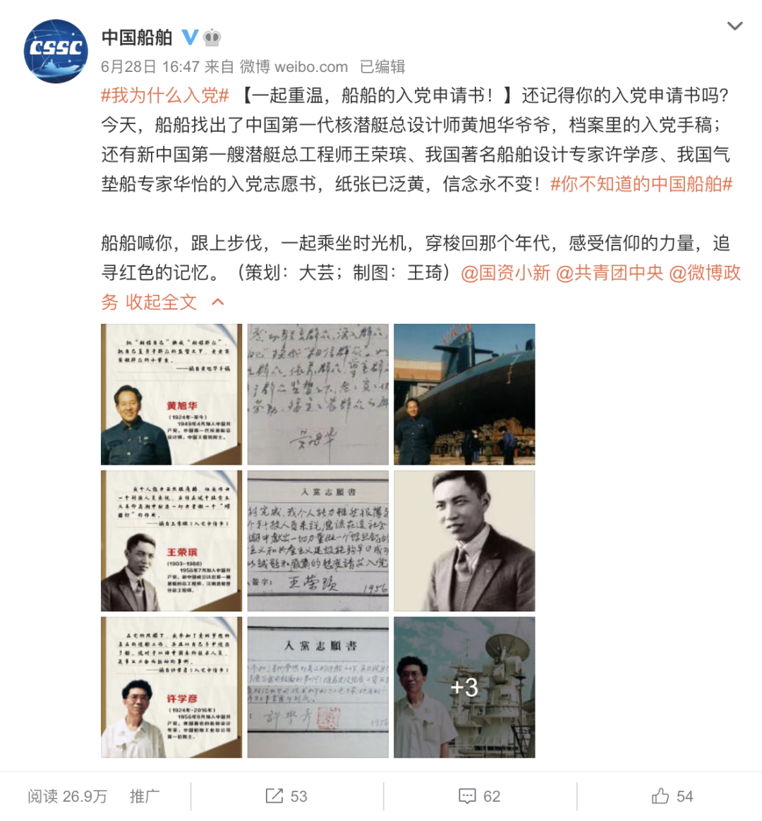 這篇微博展示了中國第一代核潛艇總設計師黃旭華、新中國第一艘潛艇總工程師王榮瑸、我國著名船舶設計專家許學彥、我國氣墊船專家華怡的親筆入黨志愿書,用一種時空穿越的方式,追尋一代人的紅色記憶,用船舶人的方式,慶祝建黨百年。