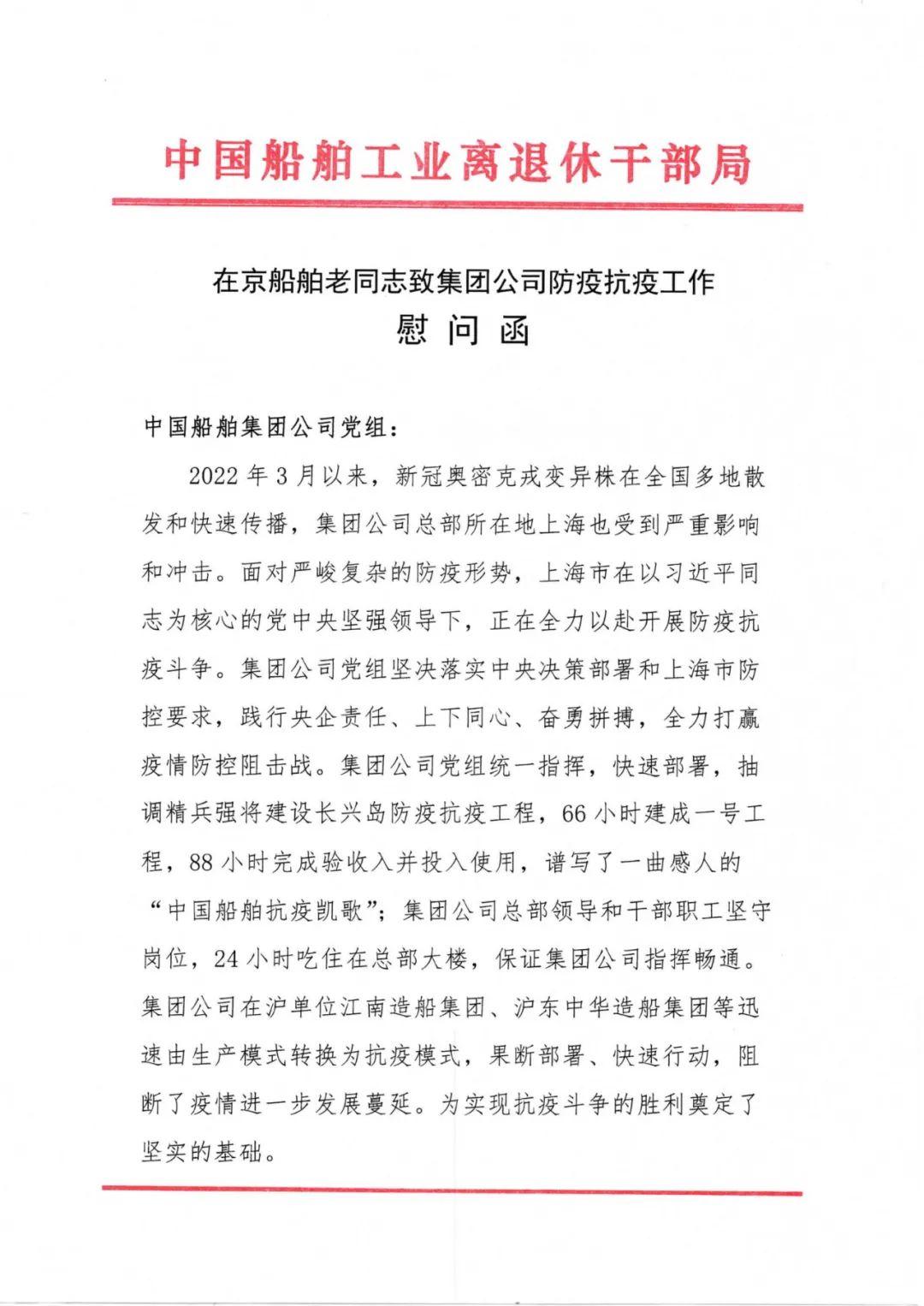 抗疫形勢嚴峻復雜,中國船舶集團離退休老領導老同志關注抗疫、心系集團,為干部職工加油鼓勁。