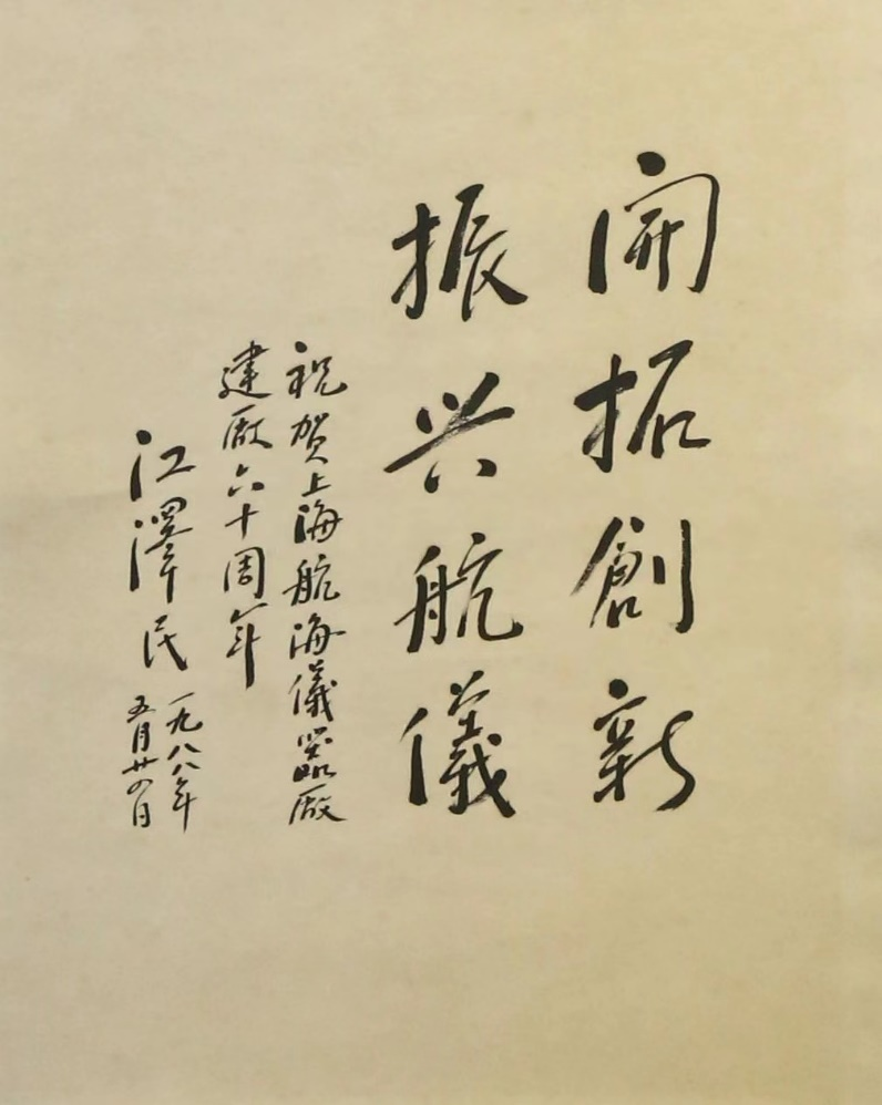江澤民同志曾給系統(tǒng)工程研究院、中船電科旗下中船航海題詞。1988年5月,為慶祝上海航海儀器廠建廠60周年,江澤民同志寫下“開拓創(chuàng)新,振興航儀”以示祝賀。