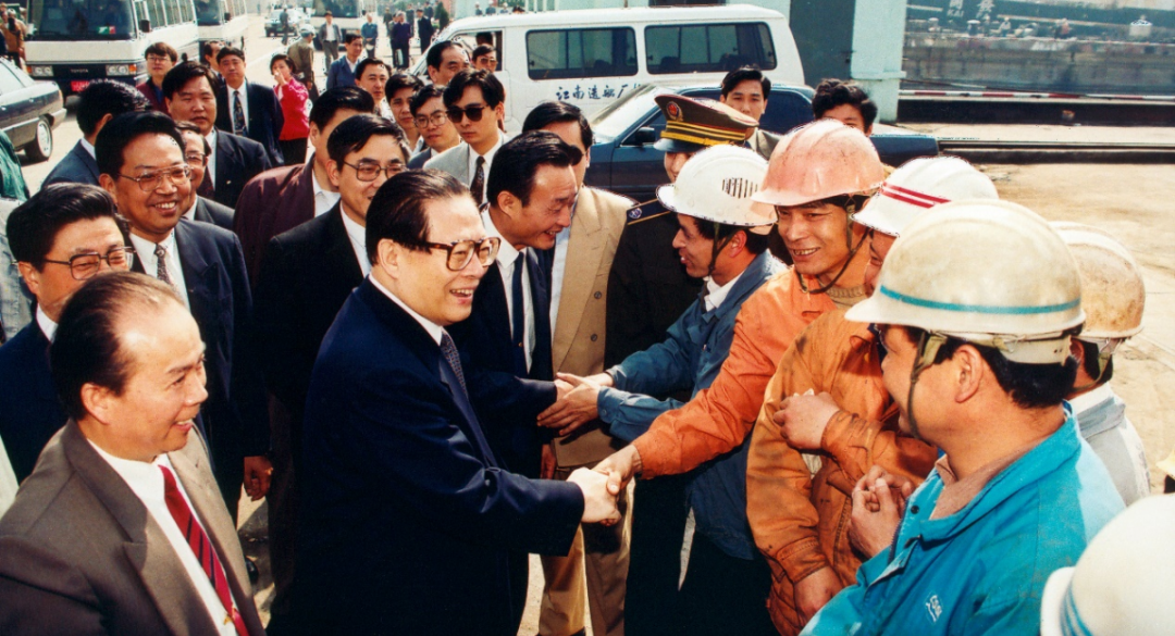 1994年4月29日,江澤民同志在視察江南造船時(shí)看望工人。