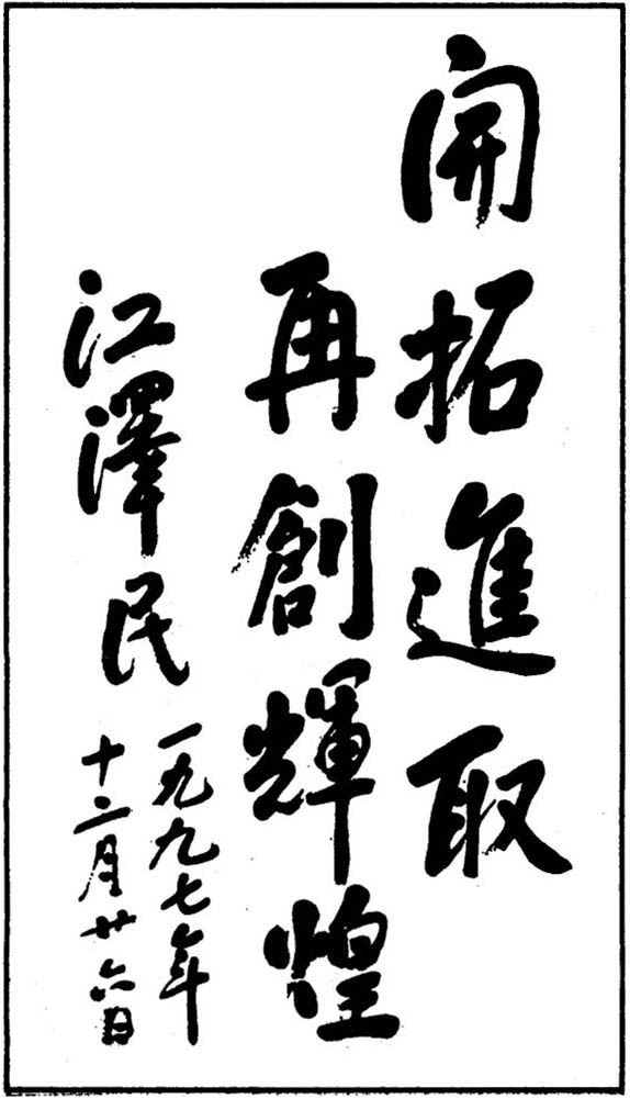 1997年12月26日,江澤民同志為中國(guó)船舶工業(yè)總公司題詞:“開拓進(jìn)取,再創(chuàng)輝煌”。