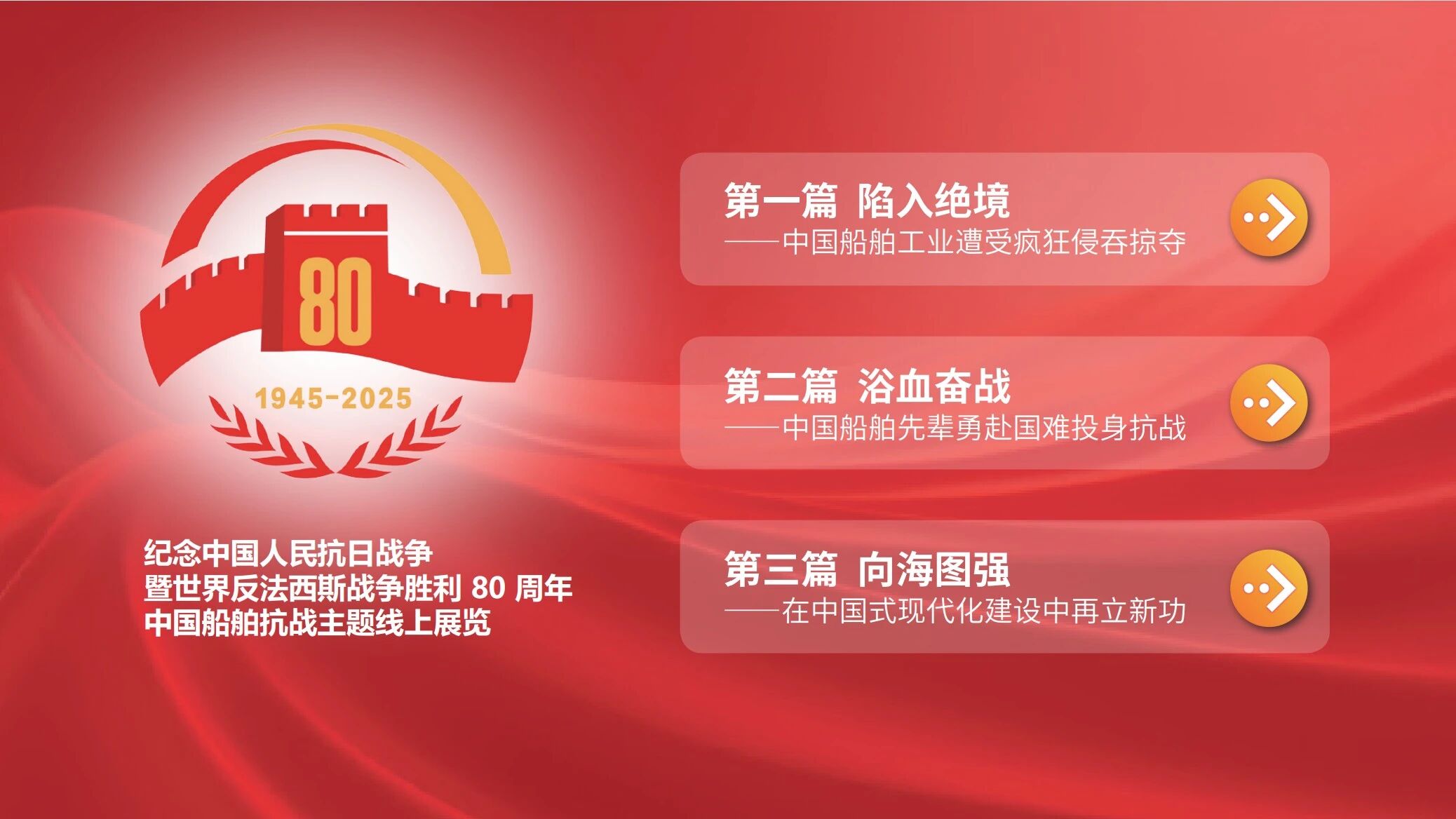 9月4日,在紀念中國人民抗日戰爭暨世界反法西斯戰爭勝利80周年之際,中國船舶集團有限公司“追尋紅色記憶 弘揚抗戰精神”主題線上展覽上線發布。